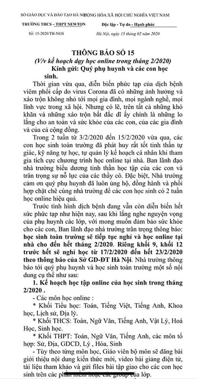 Tuy nhiên, ngày 17/2 trên nhiều diễn đàn trực tuyến, các cư dân chia sẻ sau văn bản có tên gọi "Thông báo số 15", ban hành ngày 15/2 của trường liên cấp Newton về việc kế hoạch dạy học online trong tháng 2/2020.