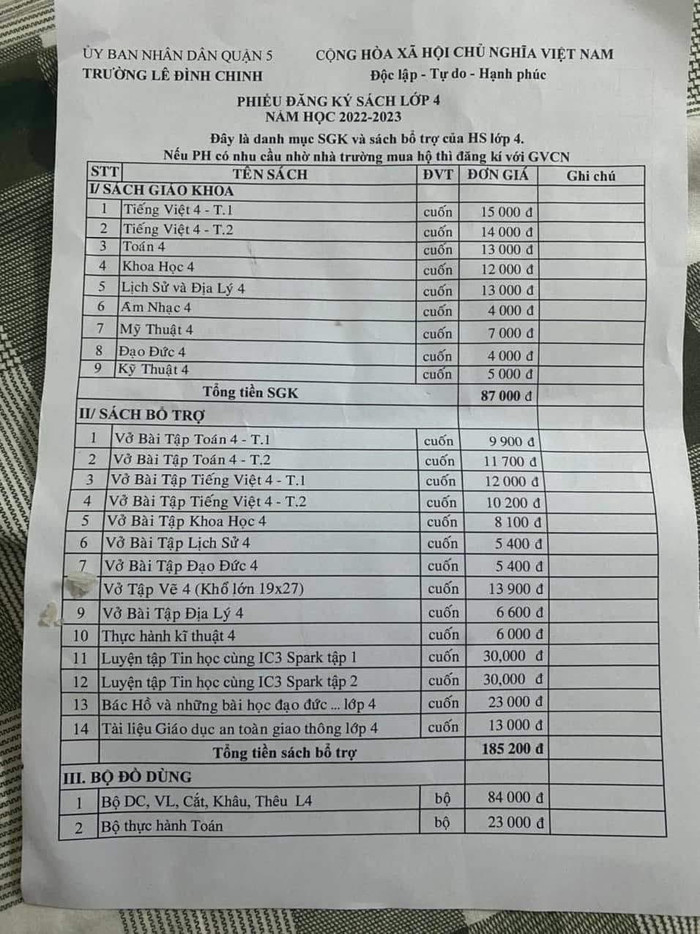 Tại Trường Tiểu học Lê Đình Chinh, quận 5, phụ huynh cung cấp danh mục các sách cần mua dành cho học sinh lớp 4, bao gồm sách giáo khoa (87 nghìn đồng), sách bổ trợ (tài liệu tham khảo, hơn 185 nghìn đồng), bộ đồ dùng (170 nghìn đồng) và sách tiếng Anh (324 nghìn đồng), bìa bao sách (232 nghìn đồng).