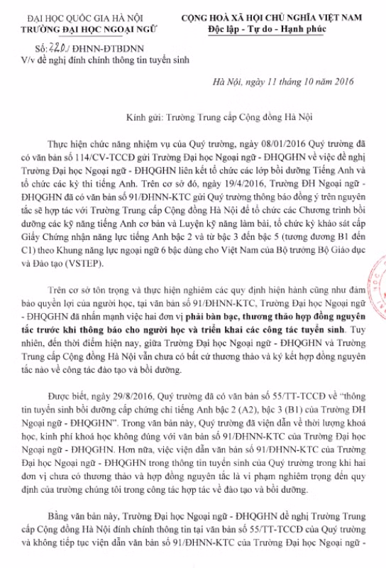 Bằng văn bản này, Trường Đại học Ngoại ngữ- ĐHQGHN đề nghị Trường Trung cấp Cộng đồng Hà Nội đính chính thông tin tại văn bản số 55/TT-TCCĐ của quý trường và không tiếp tục viện dẫn văn bản số 91/ĐHNN-KTC của Trường Đại học Ngoại ngữ - ĐHQGHN vào trong các thông báo tuyến sinh của quý trường cho đến khi hai đơn vị có những thương thảo và hợp đồng nguyên tắc chính thức…