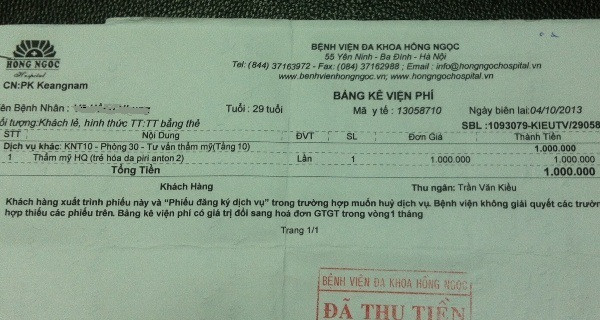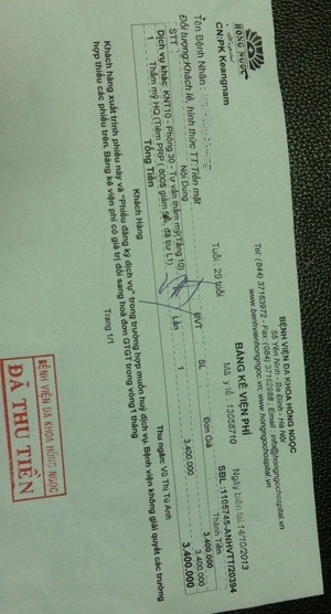 | Những biên lai chị H.N đóng tiền cho phương pháp điều trị tiêm PRP tại bệnh viện Hồng Ngọc. |