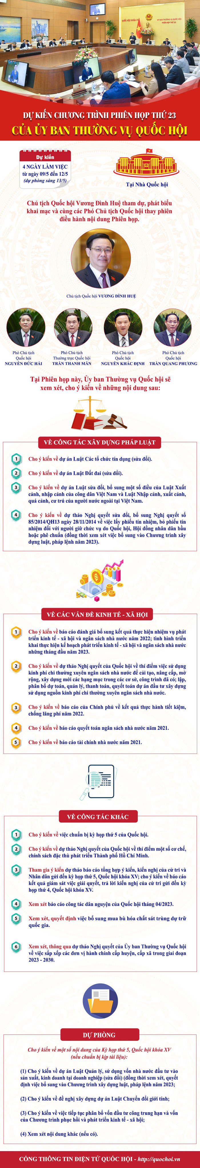 Theo dự kiến, Phiên họp thứ 23 của Ủy ban Thường vụ Quốc hội sẽ khai mạc vào sáng 09/5/2023 tại phòng họp Tân Trào, Nhà Quốc hội để cho ý kiến nhiều nội dung quan trọng.