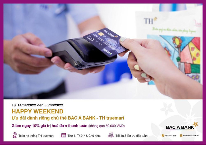 Nhằm tối ưu trải nghiệm Khách hàng khi mua sắm, tiêu dùng các dòng sản phẩm đa dạng, đẳng cấp từ Tập đoàn TH, từ ngày 14/04/2022 đến ngày 30/06/2022, Ngân hàng TMCP Bắc Á (BAC A BANK) triển khai Chương trình ưu đãi siêu hấp dẫn Happy Weekend dành tặng các chủ thẻ BAC A BANK - TH truemart.
