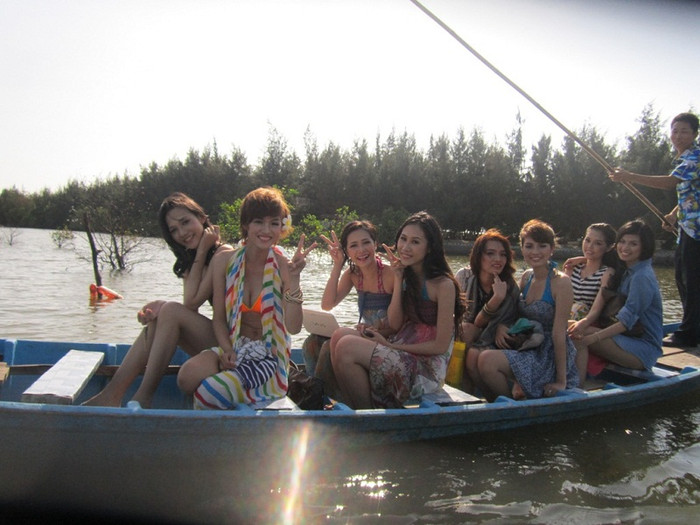 | Thúy Hạnh và 25 thí sinh Miss Parkson phải đi xuồng nhỏ tới bãi biển để thực hiện bộ ảnh bikini. |