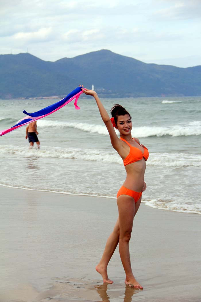 | Bùi Thị Hà Anh (bên phải) gợi cảm với dải lụa trên tay. |
