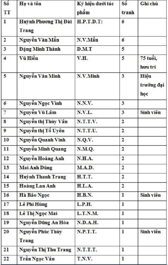 Khách thăm phòng tranh Việt Nam được nhận một tờ danh sách tên của tác phẩm và tác giả (ký hiệu dưới tác phẩm).