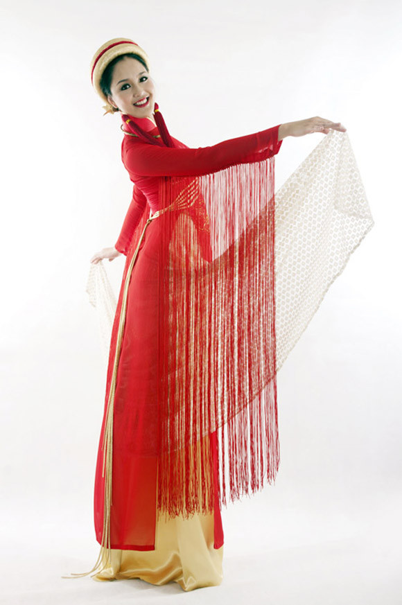 | Chất liệu được sử dụng để tạo ra bộ trang phục này gồm lụa, tơ và voan. Trên thân áo còn có những cánh hoa sen được thêu hết sức tinh xảo, công phu. |