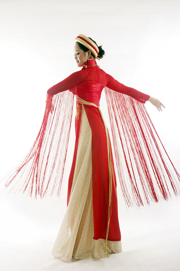 | Để có bộ trang phục áo dài này, nhà thiết kế Võ Việt Chung đã phải nghiên cứu nhiều tư liệu về sen cổ. Cuối cùng, anh đã chọn hình ảnh sen vàng thời Lý - một biểu tượng được sử dụng rất nhiều trên các nét chạm trổ ở đình, chùa, các vật dụng gốm sứ... |