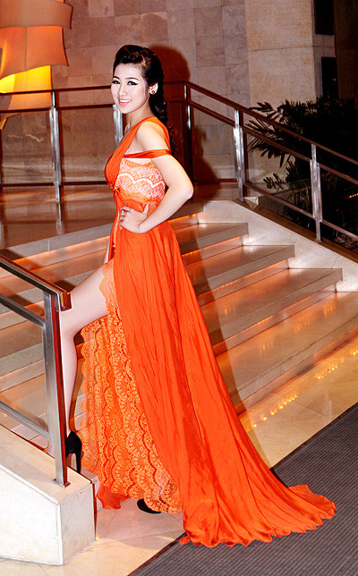 | Thời gian gần đây, Dương Tú Anh liên tục đắt show event. Tối qua, cô có dịp khoe nhan sắc tươi trẻ của lứa tuổi 19 khi chọn bộ đầm của nhà thiết kế Hoàng Hải. Chiếc váy màu cam với đường xẻ táo bạo giúp cô để lộ đôi chân dài thon thả. Phần ngực của bộ trang phục được cắt cúp tinh tế, tôn lên vòng 1 đầy đặn của Á hậu. |