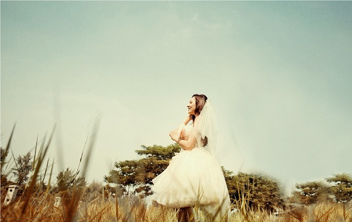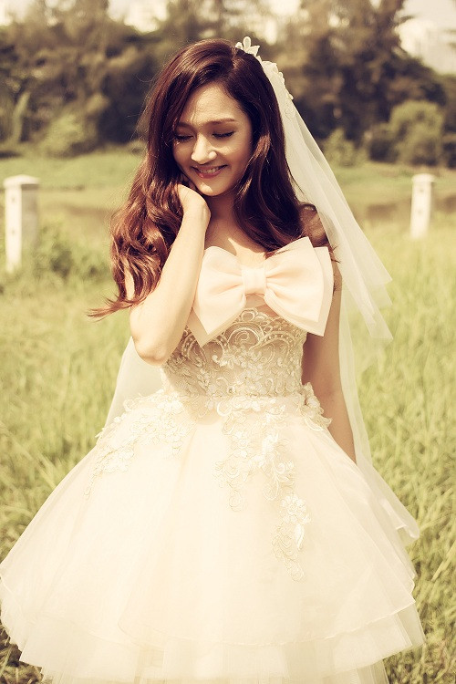 | Váy công chúa bồng bềnh, khăn voan trắng muốt làm nổi bật vẻ đẹp trong sáng của cô nàng. |