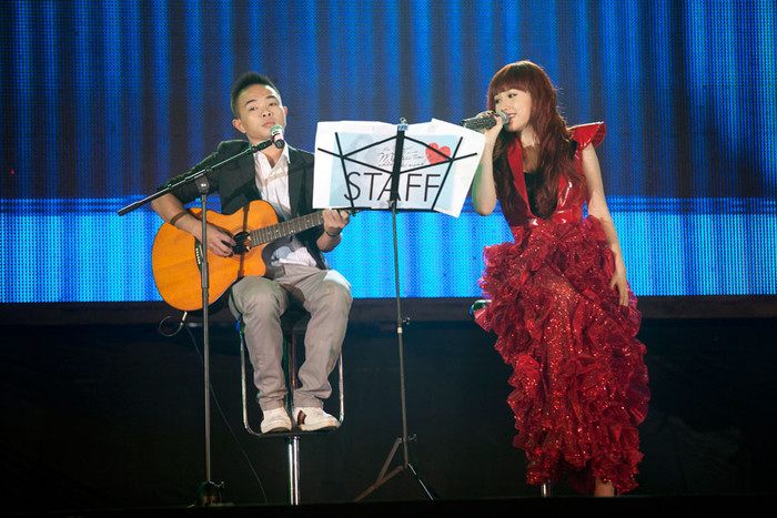 | Mặc dù trời mưa nhưng Bảo Thy vẫn diễn hết mình trên sân khấu để đáp lại sự yêu mến của khán giả. |