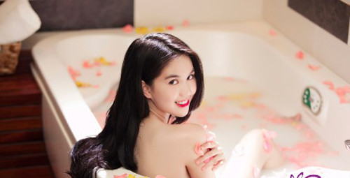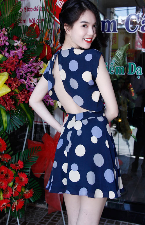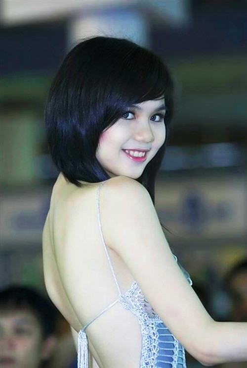 | "Búp bê" Ngọc Trinh sinh năm 1990, cao 1,71 m với các số đo 85-58-91. Ngoài hình thể đẹp, cô còn có gương mặt bầu bĩnh và đôi mắt to tròn. Tư thế chụp ảnh quay lửng ngoảnh mặt lại thế này phát huy hiệu quả đôi mắt biết nói của cô. |