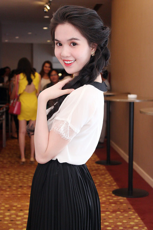 | Tại buổi họp báo giới thiệu chương trình thời trang Đêm hội chân dài 6, Ngọc Trinh thơ ngây và quyến rũ với kiểu tóc tết một bên và bộ trang phục rất kín đáo. Cô từng trả lời báo chí khi được hỏi về bộ trang phục của mình: "Trinh mặc áo Zara, còn váy là hàng Hong Kong không hiệu". |