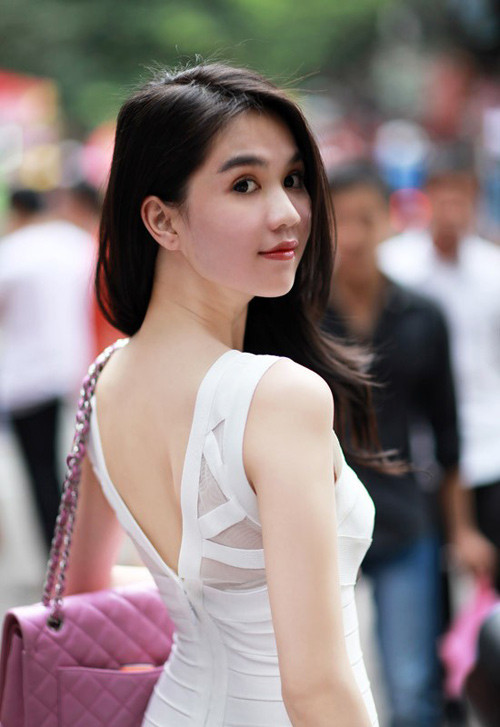 | Trong chiếc váy nền nã giữa phố đông, Ngọc Trinh vẫn nổi bật. |