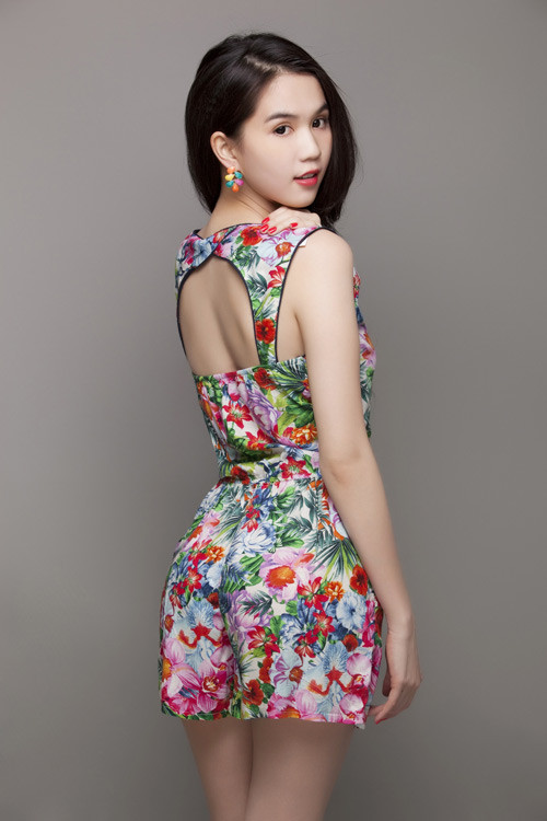 | Ngọc Trinh đóng vai một cô nàng ngoan hiền, nữ tính với trang phục họa tiết họa - xu hướng đình đám trong hè 2012. |
