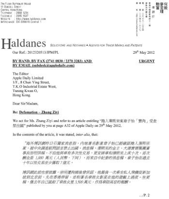 | Thư của luật sư phía công ty quản lý Chương Tử Di tới tờ Apple Daily. |