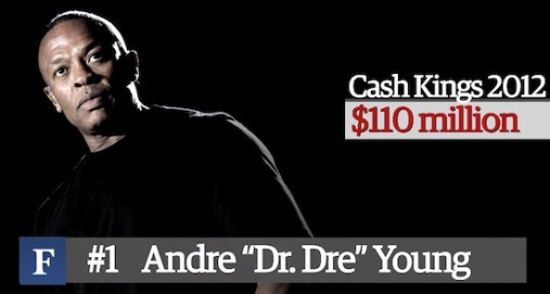 Theo công bố của Forbes, nghệ sĩ nhạc có thu nhập khủng nhất năm nay là nghệ sĩ nhạc hip-hop Dr. Dre với tổng giá trị tài sản 110 triệu USD. Thế nhưng vị trí số 1 này không phải Dr. Dre kiếm được từ việc phát hành album hay tổ chức tour lưu diễn… mà do hãng HTC đã mua 300 triệu USD từ 51% cổ phần từ công ty Beats của ca sĩ này hồi cuối tháng 8 vừa rồi.