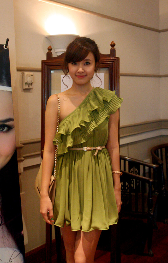 | Hot girl Midu váy xanh giản dị tới chia vui cùng Vy Oanh. |