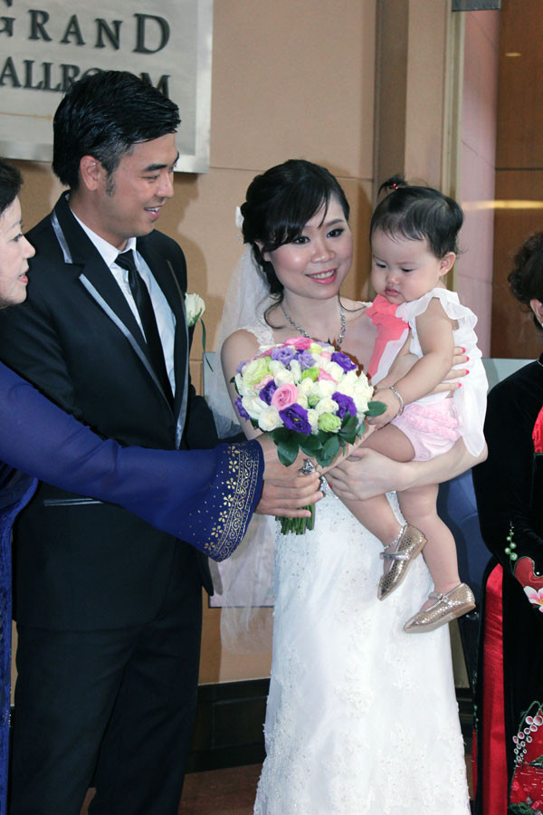 | Dù đang mặc soire nhưng cô dâu vẫn không ngại bế con của một người bạn |