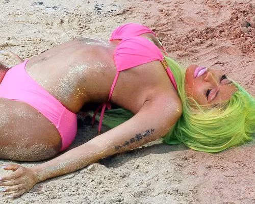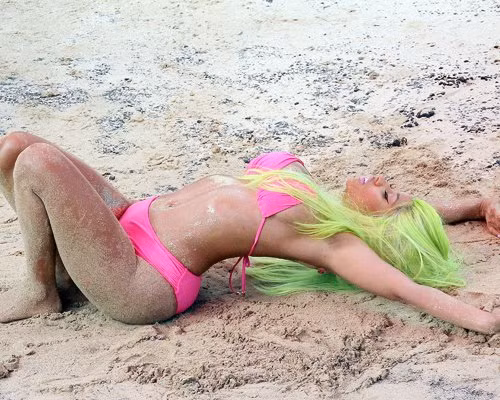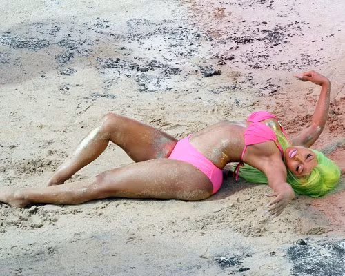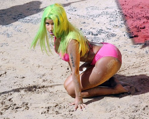 | Nữ ca sĩ của "Super Bass" đi chân trần và nằm lên bãi cát rộng lớn ở Oahu, Hawaii. Nicki Minaj dường như luôn "lăn lộn" trên bãi cát, khiến cả người dính đầy cát. |