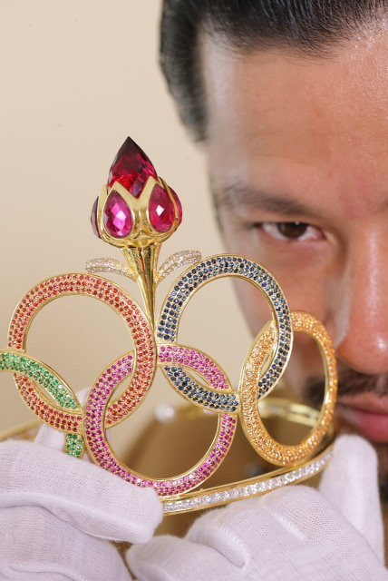 | Chất liệu để làm nên chiếc Vương miện bao gồm ngọc trai, kim cương, đá ruby, sa phia... |