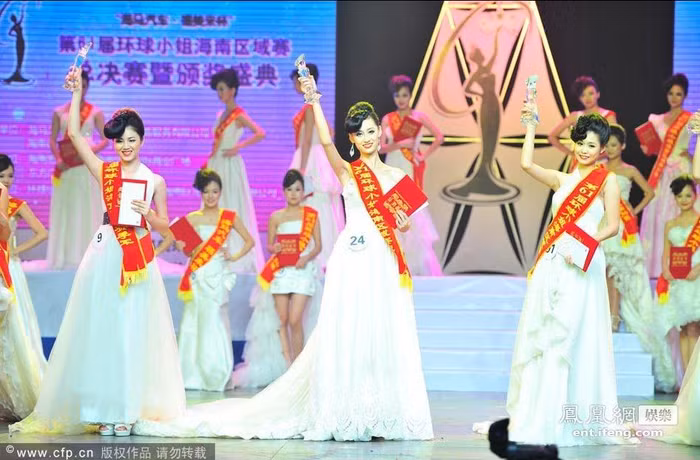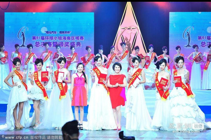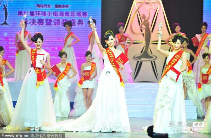 | Chung kết cuộc thi Hoa hậu Hoàn cầu khu vực tỉnh Hải Nam lần thứ 61 diễn ra đêm 17/7 tại thành phố Hải Khẩu. Thí sinh mang số báo danh 24 Đàm Kiều Y giành ngôi vị Hoa hậu, Á hậu 1 thuộc về thí sinh Tĩnh Nhã số báo danh 91 và Trương Hinh Nhụy mang số báo danh 09 trở thành Á hậu 2. |