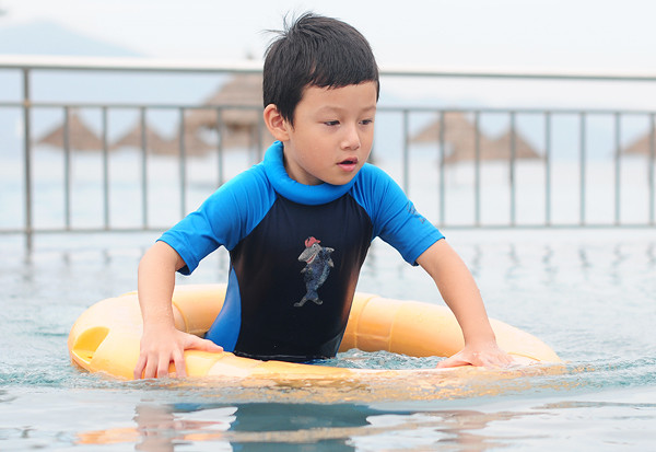 | Vì bận rộn chuẩn bị kịch bản và bàn cách dẫn với MC Anh Tuấn, có hôm, Bảo Nam tự đi ra bể bơi cùng với một stylist. Hotboy nhí tự tập bơi bằng phao nhưng không dám lặn vì sợ nước vào mũi. |