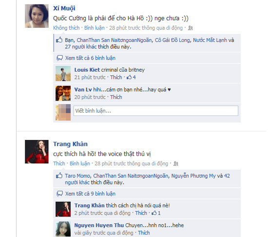 Thậm chí, các sao Việt như Trang Trần, Nathan Lee tối qua cũng ở nhà xem Giọng hát Việt và tỏ ra thích thú với chương trình. Trang Trần viết trên facebook cá nhân: “Cực thích Hà Hồ. The voice thật thú vị”. Còn Nathan Lee thì lại có lời khen ‘ăn theo’ Hà Hồ: “Tình hình là facebook đang bị bấn loạn The voice”.