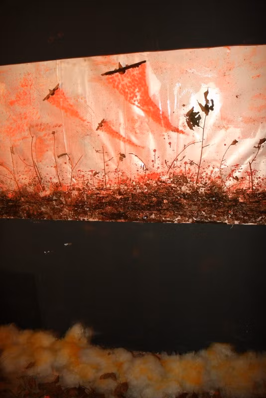 | Hình ảnh mượn cảm hứng từ truyện "Rừng xà nu" của nhà văn Nguyễn Trung Thành về những người lính bị giặc chặt đầu, treo trên những cọc tre, cắm trên những viên đá nhuộm đỏ máu. Bên dưới là một màu xanh tượng trưng cho hòa bình được đánh đổi bới xương máu của những người lính. |