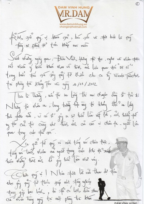 Suốt trong những ngày qua, Đàm Vĩnh Hưng đã đọc, nghe và nhận được rất nhiều ý kiến khác nhau về hình ảnh liên quan đến “sự cố” trong buổi đấu giá gây quỹ từ thiện cho ca sĩ Wanbi Tuấn Anh tại phòng trà Không Tên ngày 4/11/2012. Theo lẽ thường, nếu tôi im lặng thì mọi chuyện cũng sẽ trôi đi. Nhưng tôi nhận ra, trong trường hợp này tôi không thể im lặng thêm nữa, vì nó sẽ gây ra sự hiểu lầm rất lớn, ảnh hưởng tới uy tín của tôi và ảnh hưởng tới hình ảnh của các vị chân tu, người liên quan trong cuộc đấu giá.