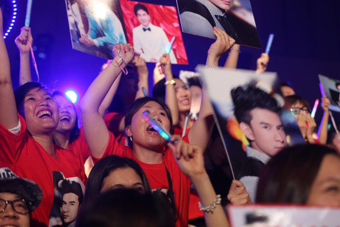 | Fan kéo đến đông nghẹt cả nhà thi đấu Nguyễn Du, nhiều khán giả phải đứng suốt chương trình để xem Đan Trường biểu diễn. |