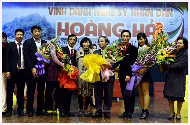 | Nghệ sỹ nhân dân Hoàng Hải nhận hoa chúc mừng. |