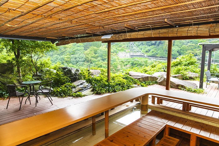 Quán café ngâm chân là nơi bạn có thể nhìn thấy Cầu treo Kinu-Tateiwa-Otsuribashi trong “khách sạn Sunshine Kinugawa".