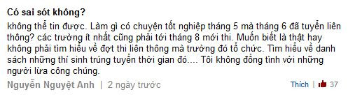 Nguyễn Nguyệt Anh cũng tỏ ra nghi ngờ: "Không thể tin được. Làm gì có chuyện tốt nghiệp tháng 5 mà tháng 6 đã tuyển liên thông? các trường ít nhất cũng phải tới tháng 8 mới thi. Muốn biết là thật hay không phải tìm hiểu về đợt thi liên thông mà trường đó tổ chức. Tìm hiểu về danh sách những thí sinh trúng tuyển thời gian đó.... Tôi không đồng tình với những người lừa công chúng".