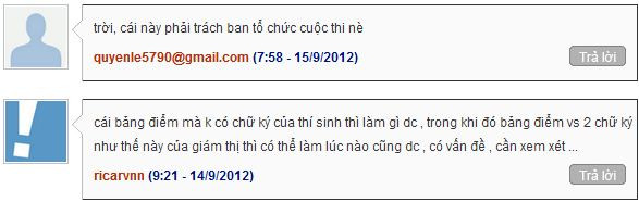 Loạt comment của độc giả Kênh 14 cũng cho thấy sự bức xúc, có phần "bất lực" : "Trời, cái này phải trách ban tổ chức cuộc thi nè", quyenle5790@gmail.com đưa ý kiến. Độc giả ricarvnn đề nghị: "Cái bảng điểm mà không có chữ ký của thí sinh thi làm gì được, trong khi đó bảng điểm với 2 chữ ký như thế này của giám thị thì có thể làm lúc nào cũng được, có vấn đề, cần xem xét".