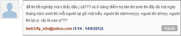 Tỏ ra bức xúc, bạn đọc có email butt3rfly_o0o@yahoo.com chia sẻ: "Đề thi tốt nghiệp mà không thấy dấu gì cả? Và ở bảng điểm họ tên thí sinh đầy đủ mà ngày tháng năm sinh thì mỗi người lại gõ một kiểu, người thì đ/mm/yyyy, người thì d/m/yy, người thì lại yy. Vậy là sao?".