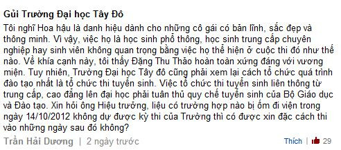 Khác với sự thất vọng của Nguyệt Anh, độc giả Trần Hải Dương lại tỏ ra thông cảm cho HH Thu Thảo nhưng lại khá bức xúc với kiểu làm ăn "mập mờ" của nhà trường: "Tôi nghĩ Hoa hậu là danh hiệu dành cho những cô gái có bản lĩnh, sắc đẹp và thông minh. Vì vậy, việc họ là học sinh phổ thông, học sinh trung cấp chuyên nghiệp hay sinh viên không quan trọng bằng việc họ thể hiện ở cuộc thi đó như thế nào. Về khía cạnh này, tôi thấy Đặng Thu Thảo hoàn toàn xứng đáng với vương miện.