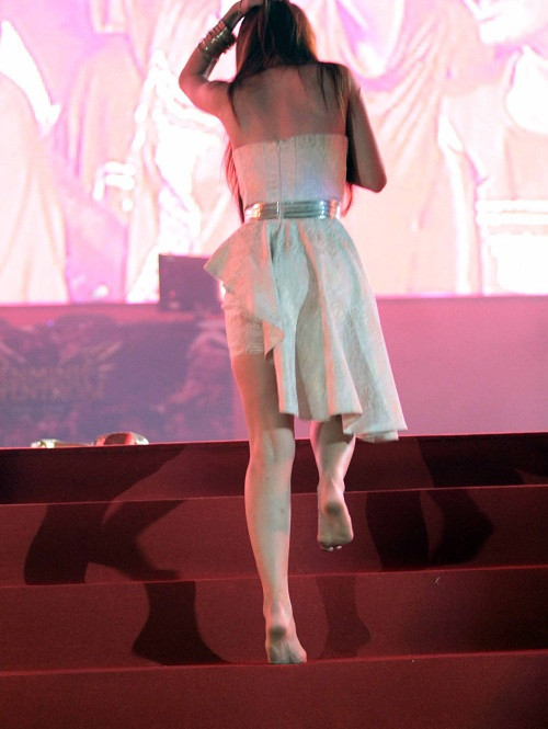 | Thậm chí, cô nàng có hành động khó hiểu trước khán giả: cúi xuống bỏ dép, biểu diễn chân trần |