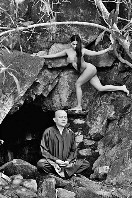 Lần này là nude 100% với cảnh cô gái đang uốn éo tìm cách dụ dỗ ông thày chùa đang ngồi thiền. Ý tưởng nhiếp ảnh “ý niệm” này của “thày” Huệ Phong - thực ra là một cư sĩ có đọc sách, “nghiên cứu” Phật giáo - nằm trong một dự án “Thoát” nghe có vẻ hoành tráng: “Trong các thứ ái dục, không gì đáng ngại bằng sắc dục…”