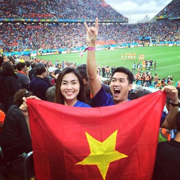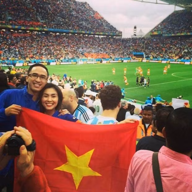 Vợ chồng diễn viên Tăng Thanh Hà lại trở thành tâm điểm chú ý của cộng đồng mạng khi cầm cờ tổ quốc ngược vào sân cổ vũ bóng đá ở World Cup 2014.