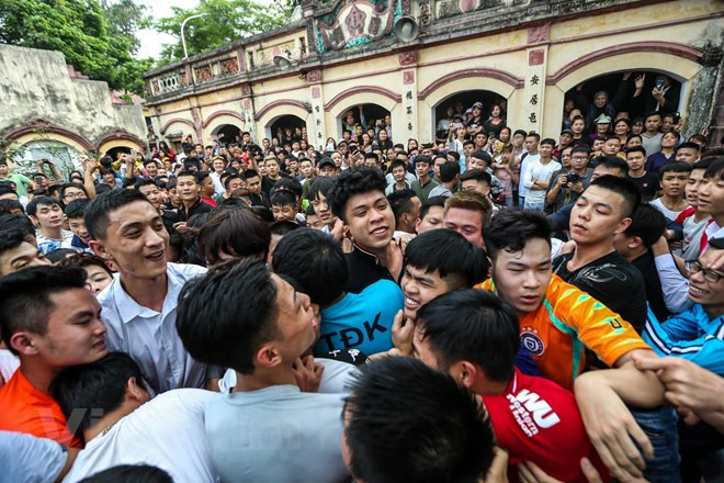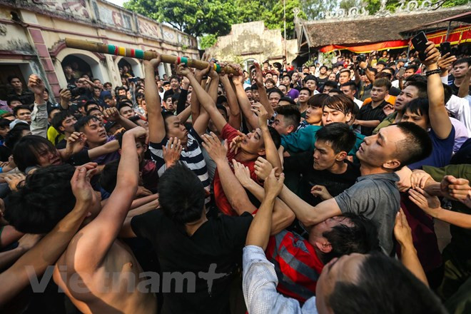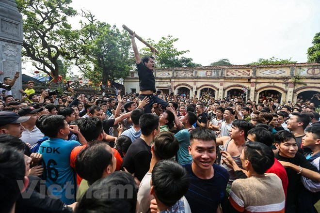 | Người may mắn giằng được cây bông mang về đình làng. (Ảnh: Thành Đạt/TTXVN) |