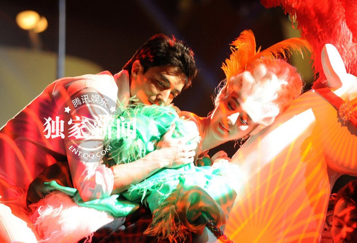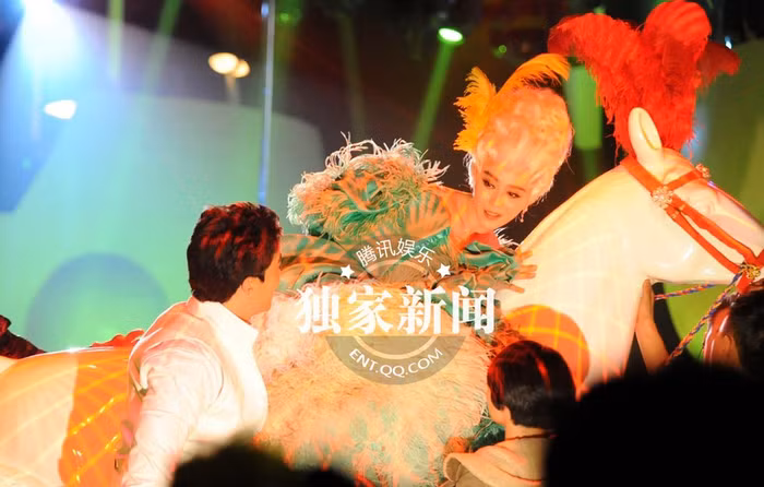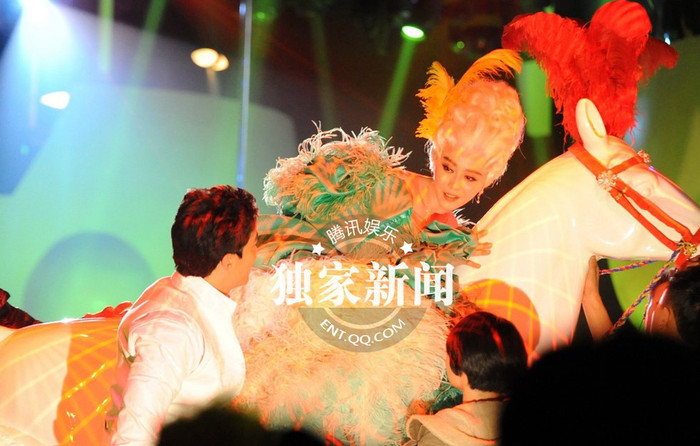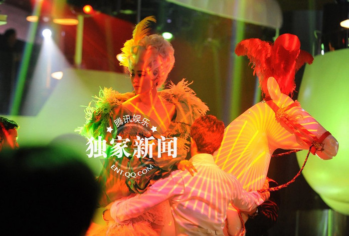 | ngồi phía sau là nam diễn viên điển trai Daniel Henry ôm eo bạn diễn cùng ngồi trên một chú bạch mã bằng gỗ. Phạm Băng Băng vừa làm động tác dập chân vào thân ngựa và lắc lư một cách nhiệt tình theo điệu n hạc. |