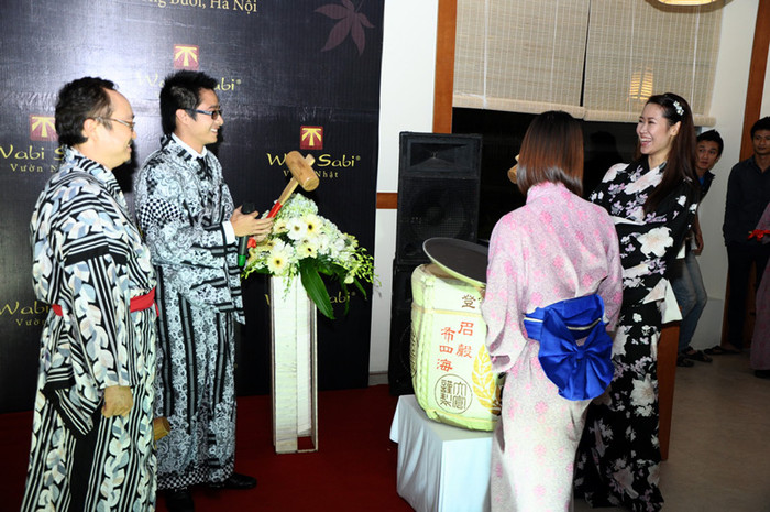 | Nghệ sỹ Đặng Thái Sơn là thầy dạy nhạc cho em chồng Dương Thùy Linh. Ông cùng 2 vợ chồng làm lễ khai trương nhà hàng theo đúng phong cách người Nhật. |