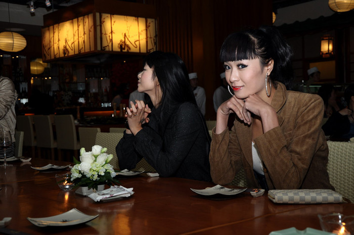 | MC Phan Anh chụp lưu niệm cùng Thùy Linh. Lúc này, vợ chồng Dương Thùy Linh đã diện trên người trang phục của Nhật Bản, chuẩn bị làm lễ khai trương nhà hàng mới. |