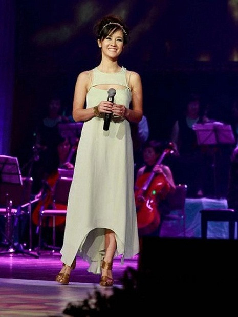 | Tối 19/10/2011, trong chương trình ca nhạc Giọt sương thu, Bống Hồng Nhung diện 1 chiếc áo dài cách điệu với chất liệu ren trong suốt. |