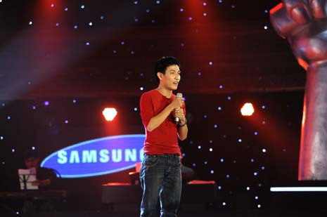 | Thí sinh Quốc Cường nhận được sự quan tâm của bộ tứ giám khảo vì không chỉ có giọng hát tốt mà còn trùng tên với chồng Hồ Học Hà. |