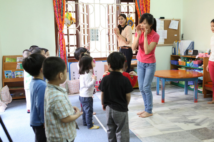 | Người đẹp cùng chơi trò chơi với các bé mầm non. |