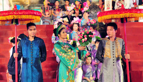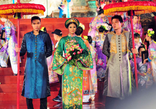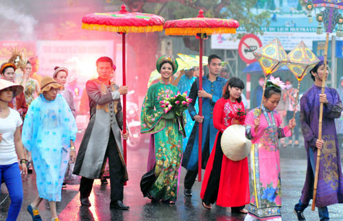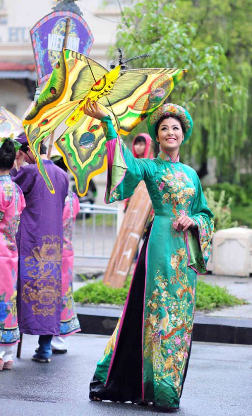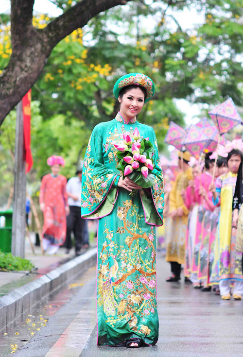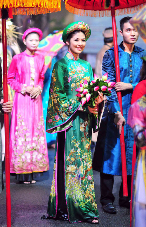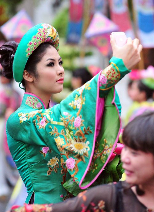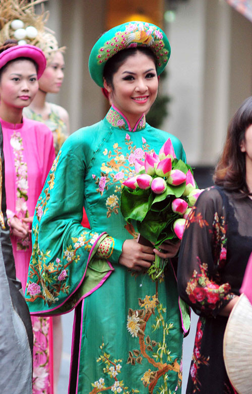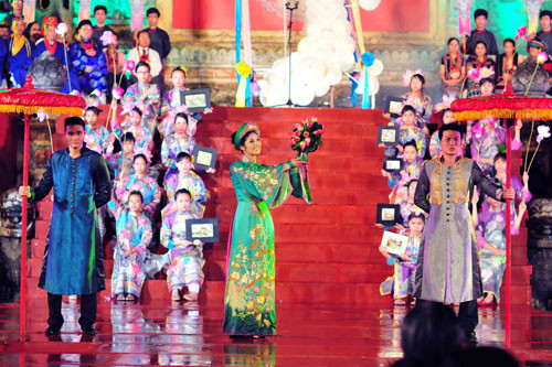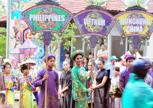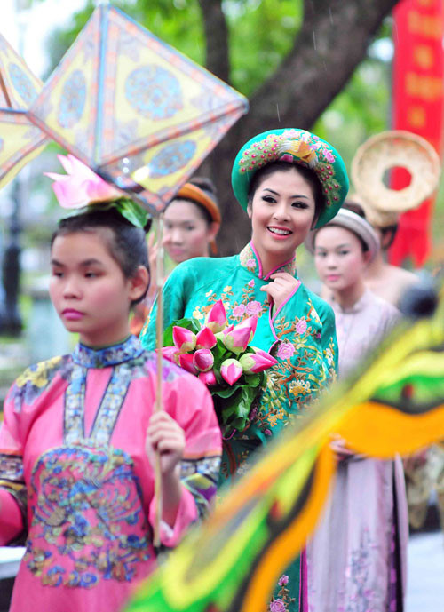 (GDVN) - Ngọc Hân hóa thân thành Hoàng hậu, đại diện cho đoàn Việt Nam trong lễ rước và tế tổ, bế mạc Festival làng nghề Huế 2013 tối 1/5. Lễ bế mạc thể hiện tinh thần tôn vinh các giá trị nghề thủ công truyền thống Việt Nam, tôn vinh và ghi nhớ công lao của tiền nhân, vinh danh các làng nghề, các thế hệ nghệ nhân.