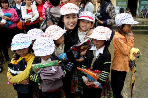 | Ngọc Hân chơi đùa với trẻ em Suối Giàng. Ảnh: Văn Trinh. |