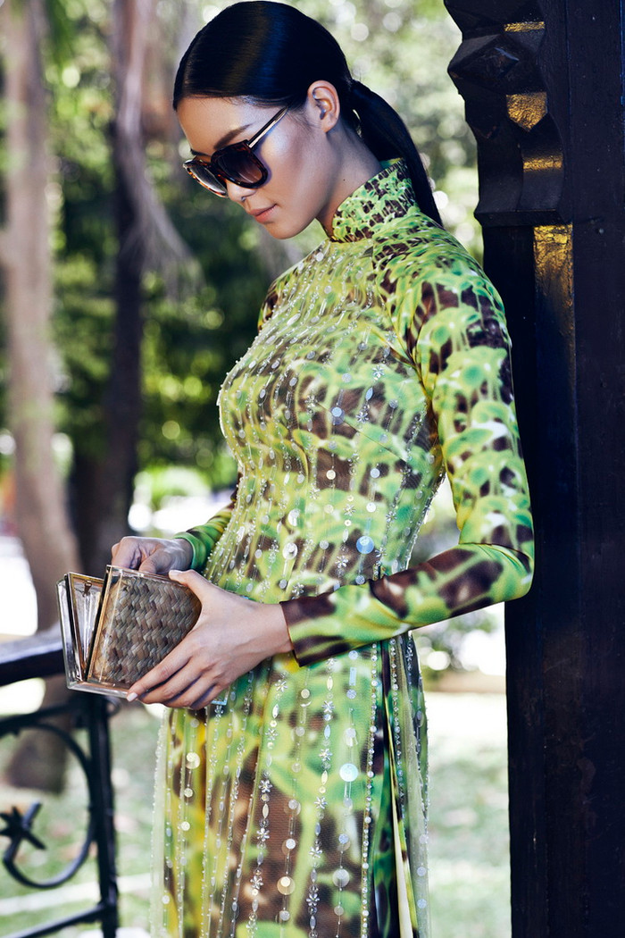 | Lần này, Hoa hậu Thùy Dung thể hiện ấn tượng bộ sưu tập áo dài của NTK Nguyễn Công Trí. Bộ sưu tập tiếp tục vận dụng kĩ thuật in màu chuyển nhiệt trên nền lụa để mang đến những chất liệu và hình ảnh mới cho tà áo dài Việt. |