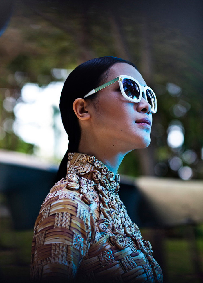 | Hoạ tiết đất đai cằn cỗi, hay vỏ thân cây cổ thụ... kết hợp với vài điểm nhấn của thời trang hiện đại như chiếc kính mát, túi xách và nón lá bằng nhựa trong suốt, thời trang nhưng vô cùng tinh tế. |